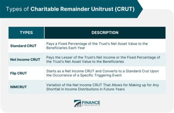 1. Charitable remainder unit trust (CRUT) pays the beneficiary a fixed percentage of the trust at least annually, often for life or a period up to 20 years.