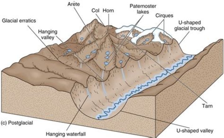 Several other topographic features derived from alpine glacial erosion are found in U-shaped valleys and their tributary valleys (Figure 17.19). Arêtes are sharp ridges formed between U-shaped glacial valleys. Cols are low points (saddles) along arêtes; they form passes (high points) between glacial valleys.