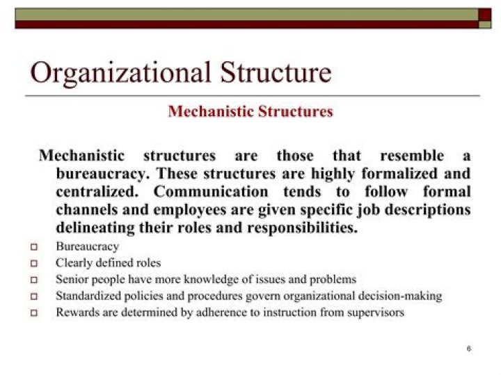 Mechanistic structures are those that resemble a bureaucracy. These structures are highly formalized and centralized. Communication tends to follow formal channels and employees are given specific job descriptions delineating their roles and responsibilities.