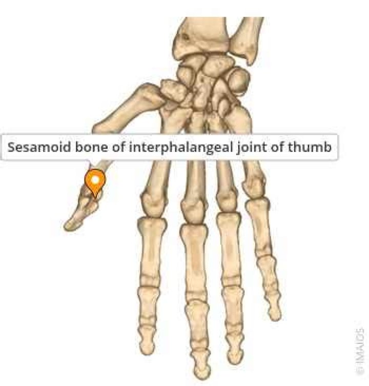 Most people have five sesamoid bones in each hand. Two at the thumb metacarpophalangeal joint, one at the interphalangeal joint of the thumb, one at the metacarpophalangeal joint of the index finger on the radial side, and one at the metacarpophalangeal joint of the little finger on the ulnar side.
