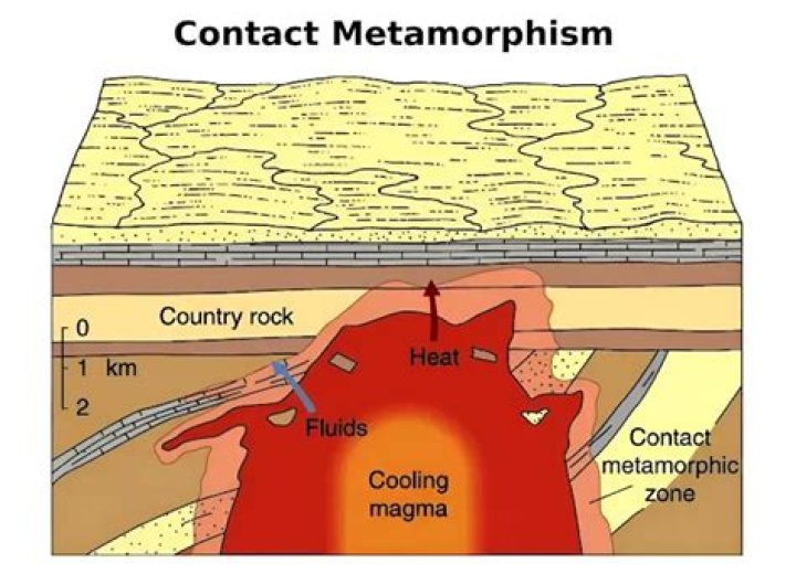 Contact Metamorphism (often called thermal metamorphism) happens when rock is heated up by an intrusion of hot magma. ... Contact Metamorphism can occur on scales from a few millimetres either side of a small intrusion, to several hundred metres around a large igneous body such as a batholith.