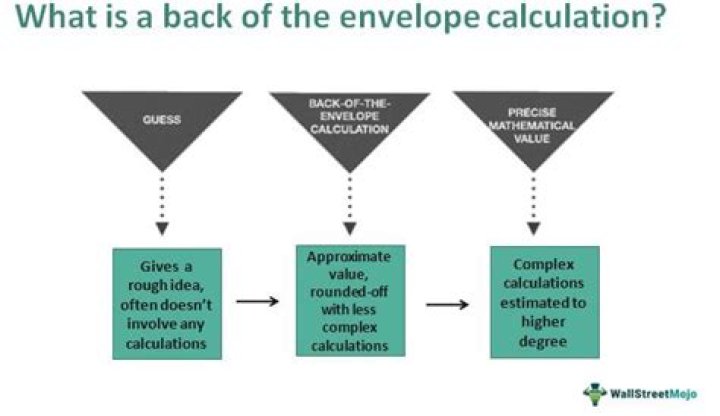 A back-of-the-envelope calculation uses estimated or rounded numbers to develop a ballpark figure quickly. The result should be more accurate than a guess, as it involves putting thought to paper, but it will be less accurate than a formal calculation performed using precise numbers and a spreadsheet or calculator.