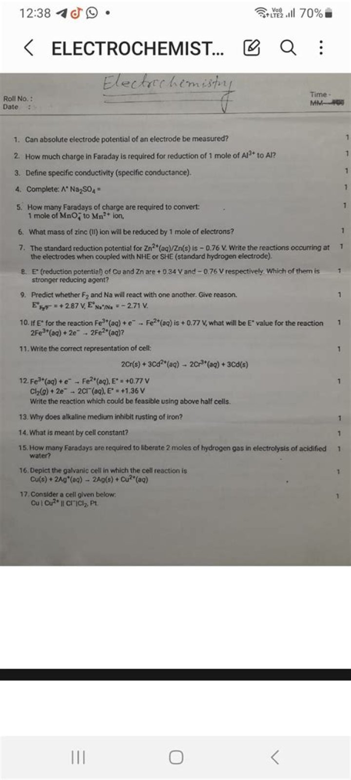The difference between electrode potentials of two electrodes of electrochemical cell when no current is drawn from the cell is known as 'Electromotive Force (EMF)' of a cell, while the difference between the electrode potential of two electrodes when the cell is sending current through the circuit is called 'Cell ...