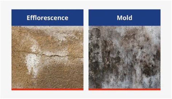 Mold can grow on just about any surface, whereas efflorescence doesn't spread and forms on cement or brick. Mold is a fungus, efflorescence is moisture that evaporates into salt deposits. ... Efflorescence is white, yellow or brown, while mold can be any color.