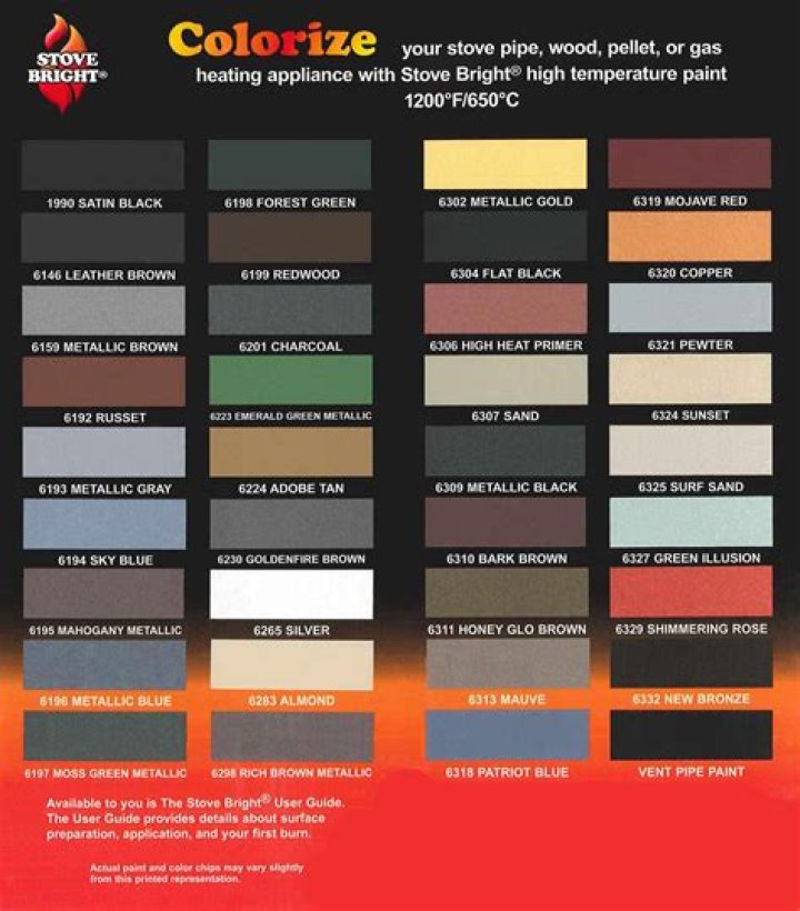 High-heat paints are available with a flat black finish, but you can also find stove paint, such as Thermalox Stove Paint in a rainbow of colors. Some also offer paints that dry with a sheen, which makes cleaning your wood stove easier.