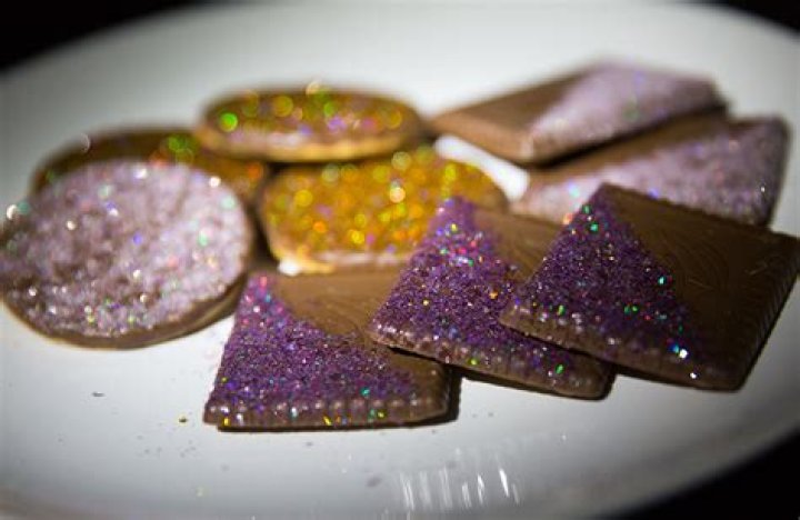 Instead of saying edible, these products might be labelled as 'non-toxic'. This is a pretty sure-fire way to know that the thing you're putting into your cake is mostly plastic. Glitter is made by combining plastic, colouring and a reflective material such as aluminium, or titanium dioxide.