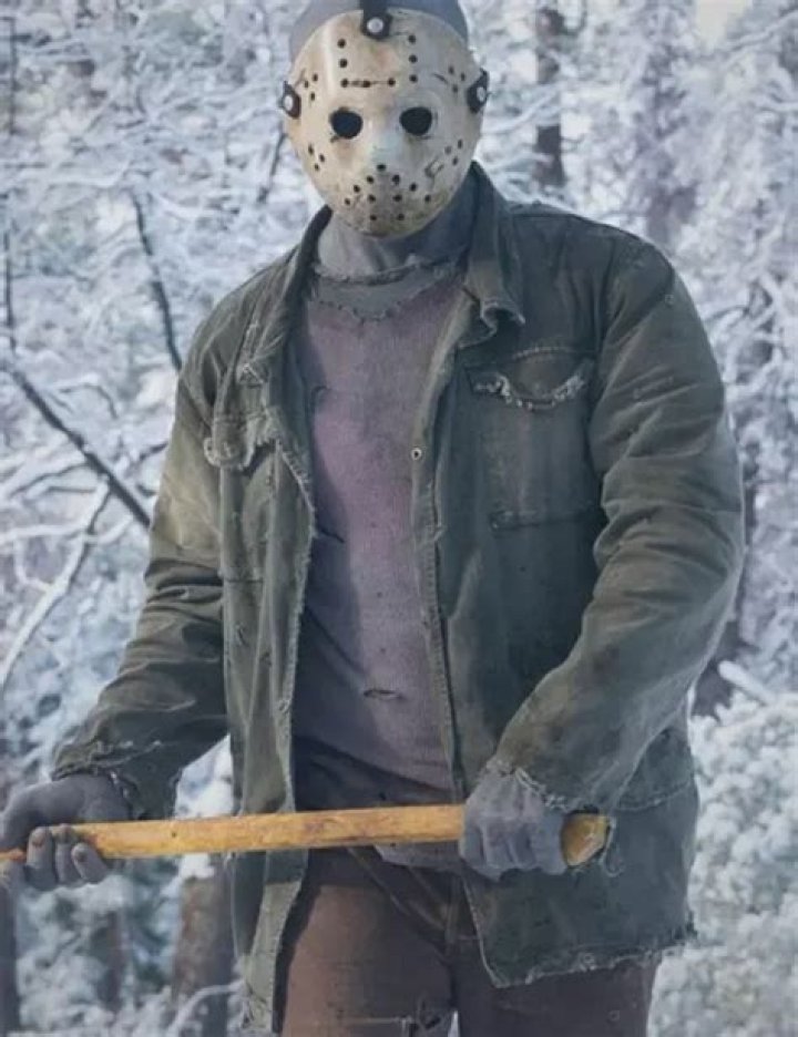 Jason wears a dark green work shirt with 2 buttoned flap pockets, weathered tan color work pants, black work boots, yellow leather gloves and a 1940s U.S. Marines utility belt. Typically used to carry a machete, throwing darts, firearm reloads, survival knife and other equipment.