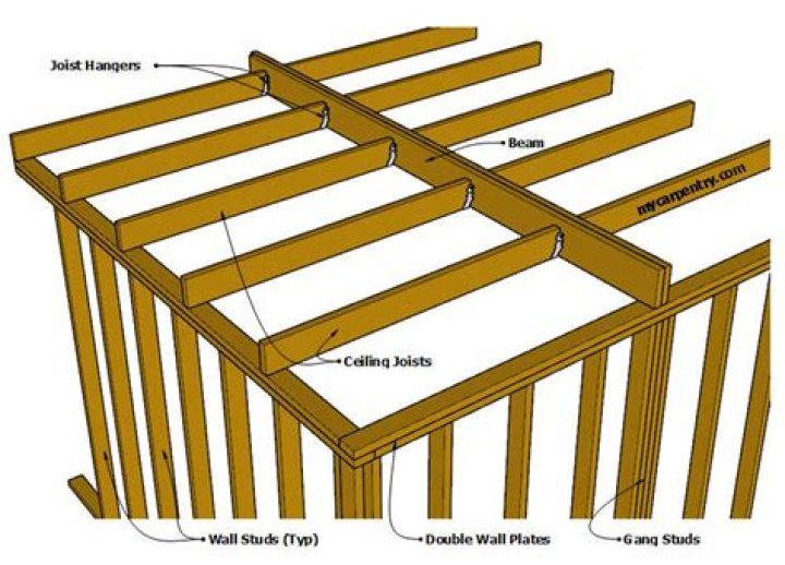 Ceiling Joists are the horizontal members that provide a structure to fix the ceiling, and support and fix the diagonal rafters that define the roof shape and are attached at the top to a ridge beam. In many modern constructions the ceiling joists are substituted by the bottom cord of a factory manufactured truss.