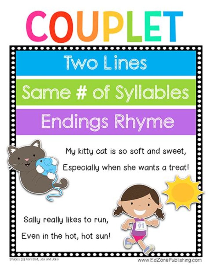 A Rhyming Couplet is two line of the same length that rhyme and complete one thought. There is no limit to the length of the lines. Rhyming words are words that sound the same when spoken, they don't necessarily have to be spelt the same.