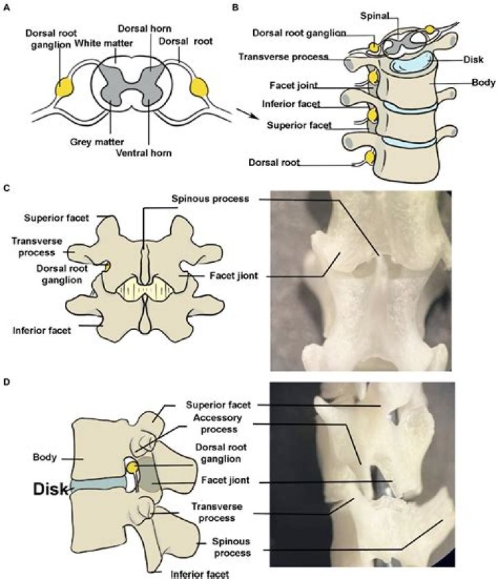 As the dorsal root emerges from the intervertebral neural foramina, it forms the dorsal root ganglion (DRG). The DRG is a group of cell bodies responsible for the transmission of sensory messages from receptors such as thermoreceptors, nociceptors, proprioceptors, and chemoreceptors, to the CNS for a response.