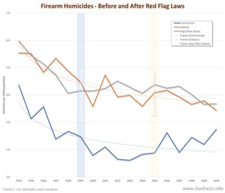 A 2019 study by gun rights advocate John Lott found red flag laws have no significant effect on murder, suicide, the number of people killed in mass public shootings, robbery, aggravated assault, or burglary.