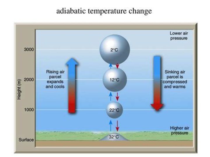 adiabatic temp change. -changing temp without adding or subtracting heat. result of compressing air or allowing allowing to expand. -rising air expands and cools.