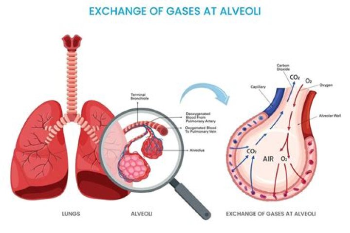 Oxygen breathed in from the air passes through the alveoli and into the blood and travels to the tissues throughout the body. Carbon dioxide travels in the blood from the body's tissues and passes through the alveoli to be breathed out.