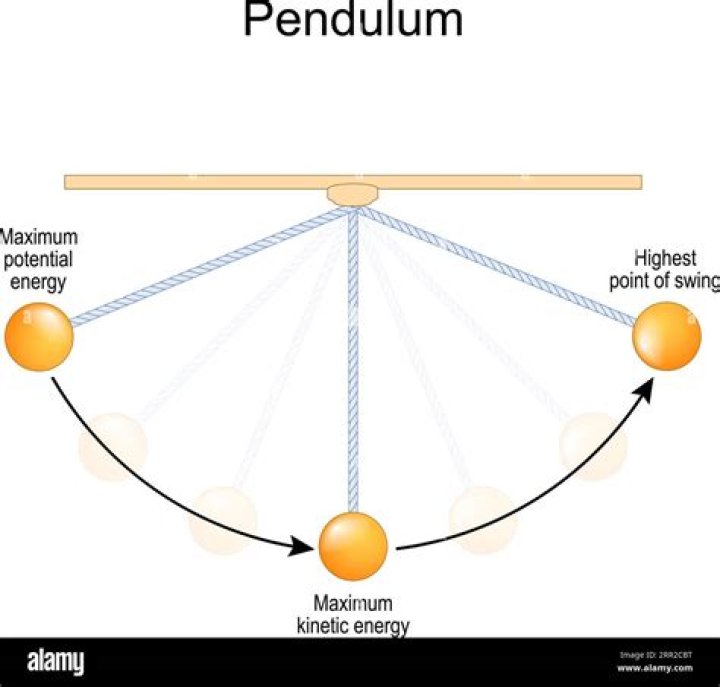 As a pendulum swings, its energy is continually converted back and forth between the kinetic energy of the moving pendulum bob and the potential energy that exists when the bob is positioned at the high point of its path. Ideally, the total energy is perfectly conserved.
