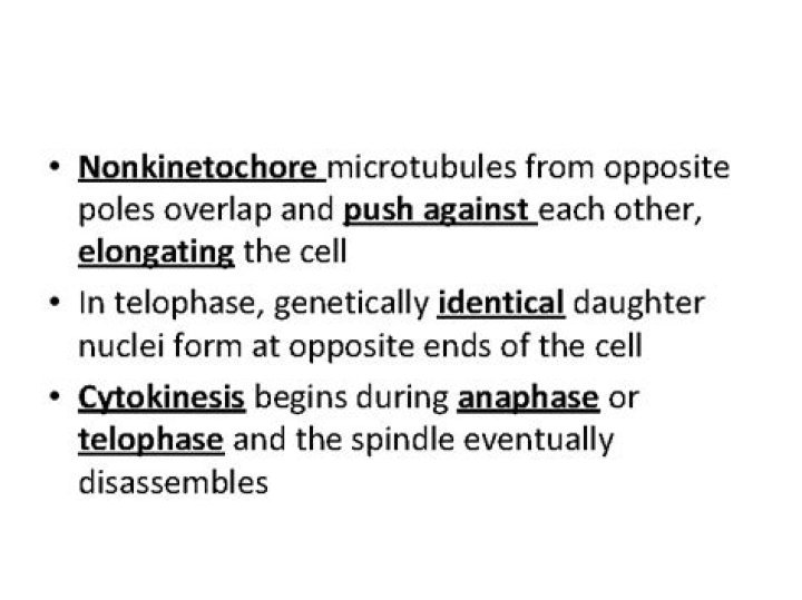Their centrosomes are pushed apart by nonkinetochore microtubules. The chromosomes are moved to the opposite ends of the cell. Telophase results in cellular elongation by the nonkinetochore microtubules. The former nuclear fragments help to create new nuclei for the daughter cells.