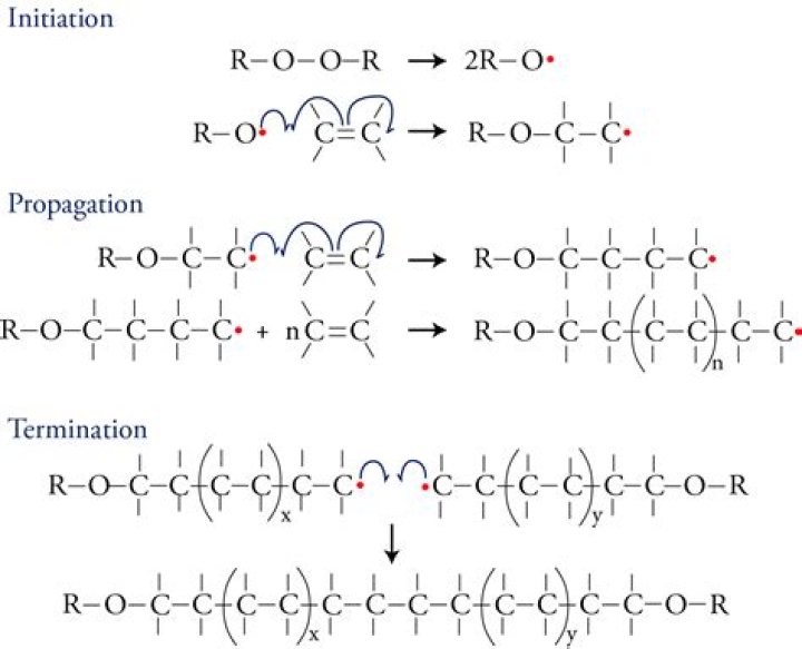 This process has three stages: initiation, propagation, and termination. In the first stage, a substance is split into two identical parts, each with an unpaired electron. (Peroxides, which contain an O-O bond, are often used in this role.)