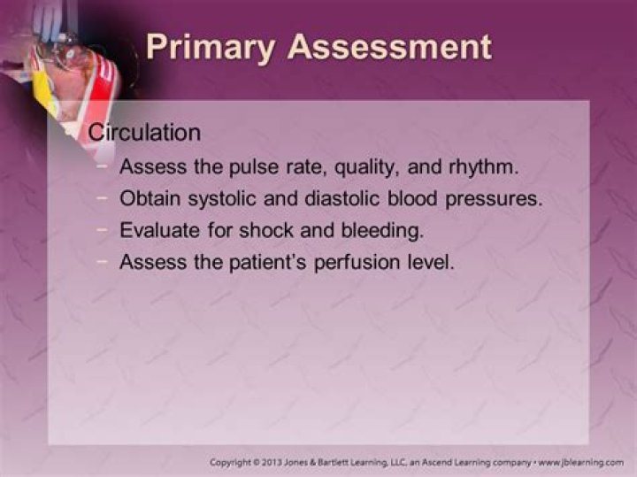 During the primary assessment, circulation is evaluated by assessing: pulse quality, external bleeding, and skin condition.