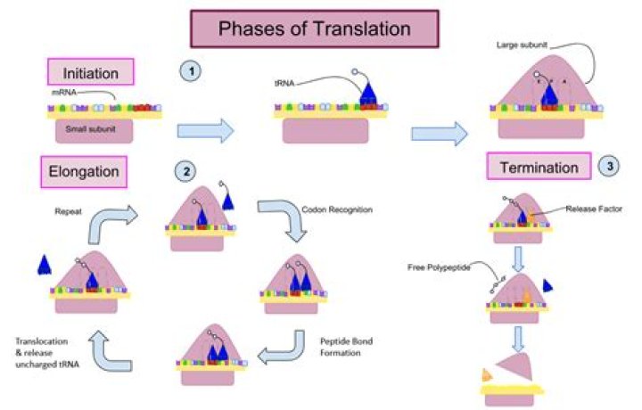 Initiation ("beginning"): in this stage, the ribosome gets together with the mRNA and the first tRNA so translation can begin. Elongation ("middle"): in this stage, amino acids are brought to the ribosome by tRNAs and linked together to form a chain.