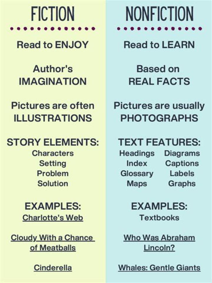 In general, fiction refers to plot, settings, and characters created from the imagination, while nonfiction refers to factual stories focused on actual events and people. However, the difference between these two genres is sometimes blurred, as the two often intersect.