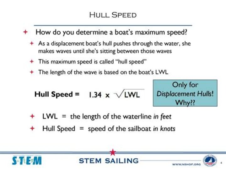 Hull Speed Formula Theoretical displacement hull speed is calculated by the formula: velocity in knots = 1.35 x the square root of the waterline length in feet.