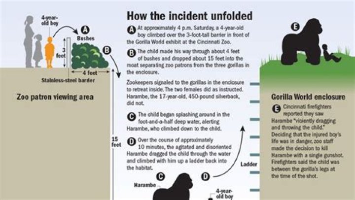On May 28, 2016, a three-year-old boy climbed into a gorilla enclosure at the Cincinnati Zoo and Botanical Garden where he was grabbed and dragged by Harambe, a 17-year-old western lowland gorilla. Fearing for the boy's life, a zoo worker shot and killed Harambe.