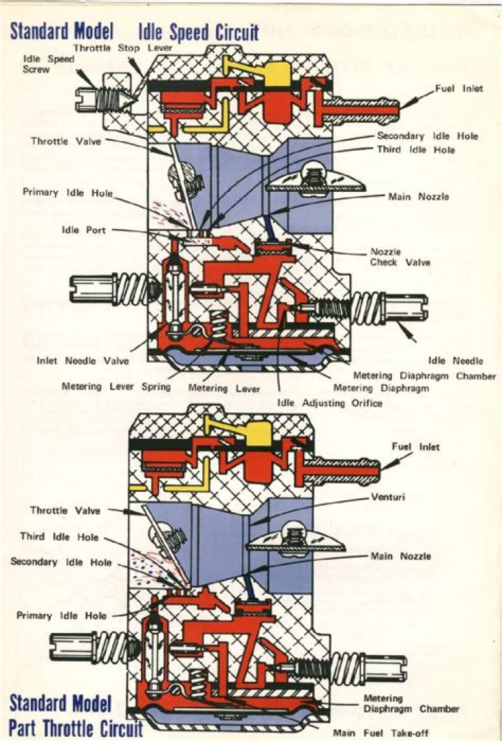 pressure, permitting fuel pressure to force the inlet needle off its seat allowing fuel to enter the metering chamber. The fuel then travels from the metering chamber through the idle and main fuel supply orifices and channels to the discharge ports, into the carburetor bore and to the engine.