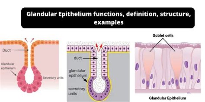 Glandular epithelium is an epithelial tissue involved in the production and release of different secretory products (e.g. sweat, saliva, mucus, digestive enzymes, hormones etc.). ... Some examples of exocrine glands include the sweat glands, salivary glands, and lacrimal glands, among others.