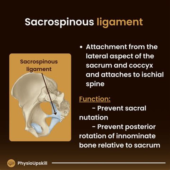 The sacrospinous and sacrotuberous ligaments connect the sacrum to the ischium. The sacrospinous ligament, originating from the lateral margin of the inferior sacrum and attaching at the ischial spine, assists in resisting external rotation forces of the pelvis.