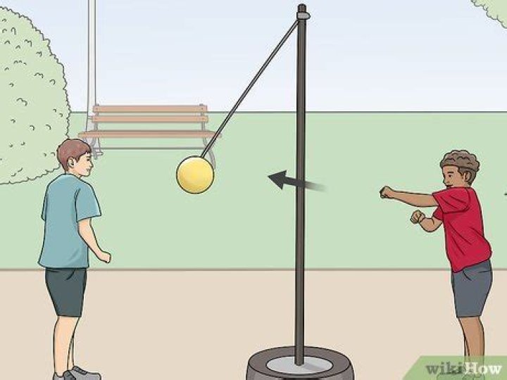 Tetherball is a game where two players use their hands to strike a volleyball which is suspended from stationary metal pole by a rope or tether. ... The game ends when one player manages to wind the ball all the way around the pole so that it is stopped by the rope. It must not bounce.