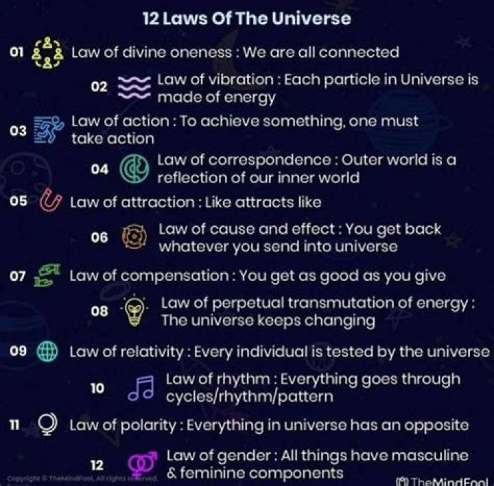 These are laws or principles that govern everything that happens in the universe. The 12 spiritual laws of the universe are designed to help humanity pursue happiness through love and forgiveness, as we harmonize our environment to create better realities.