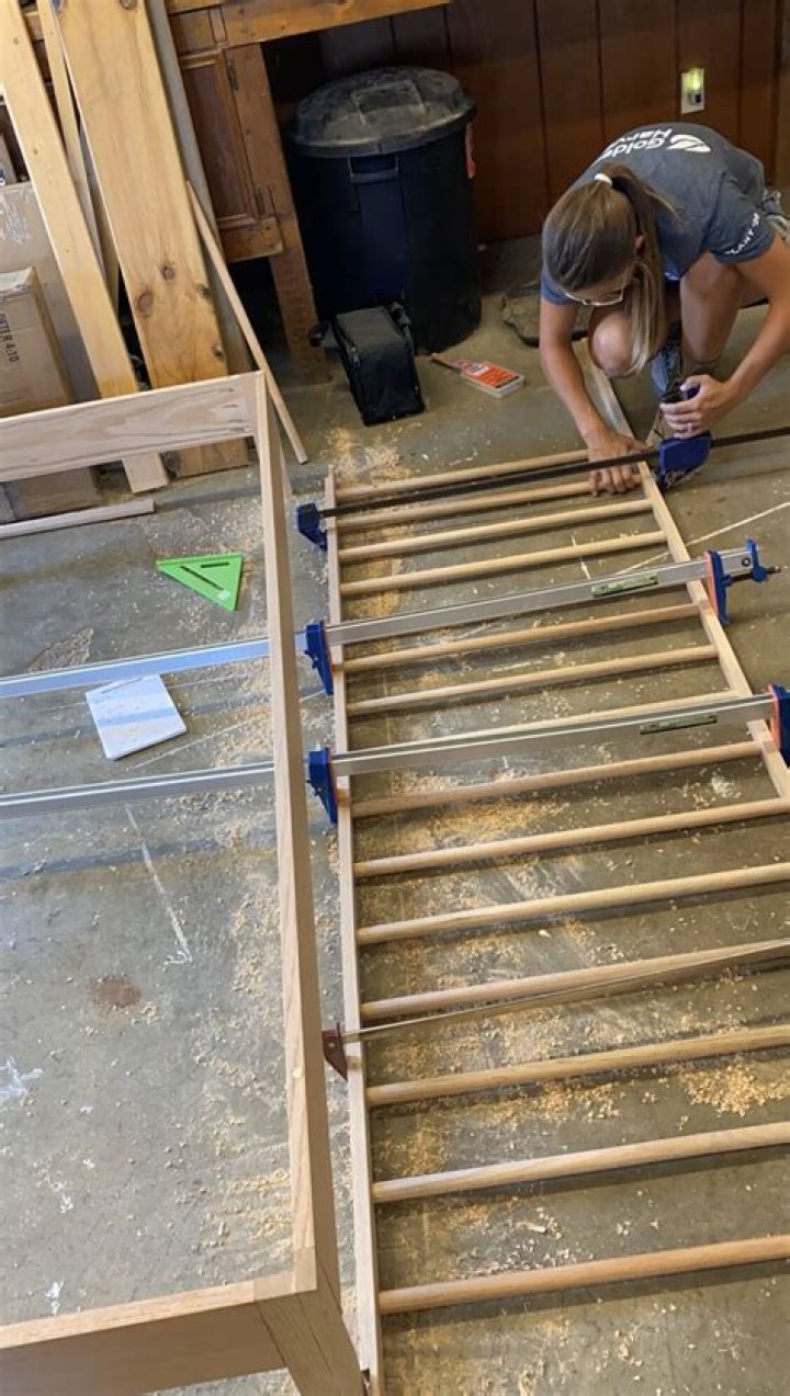 Most Wood glues only need clamps on them for about 30 minutes to 1 hour. After that point, you can do some light sanding, as long as you do not subject the joints to stress. The glue has not cured fully at that point, so the joint does not have full strength. It will reach full strength in about 24 hours.