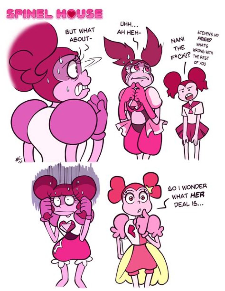 Rebecca Sugar stated Pink Diamond abandoned Spinel because she found her grating and overwhelming and "Pink... wanted to feel like she was moving forward. This Gem was given to her to placate her in a certain way, and she was ready to move on. ... Pink, she grew out of her.