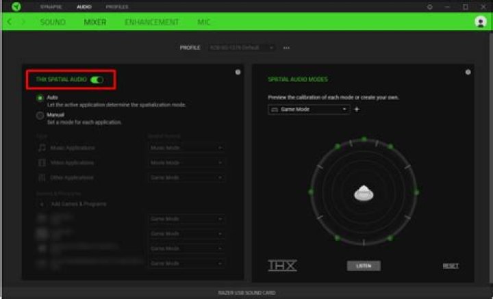 After restarting your PC, launch Synapse 3. Click on Razer USB Sound Card and then click on "Mixer" to find the THX Spatial Audio menu. Activate “THX SPATIAL AUDIO” by toggling it on. Your THX Spatial Audio is now activated.