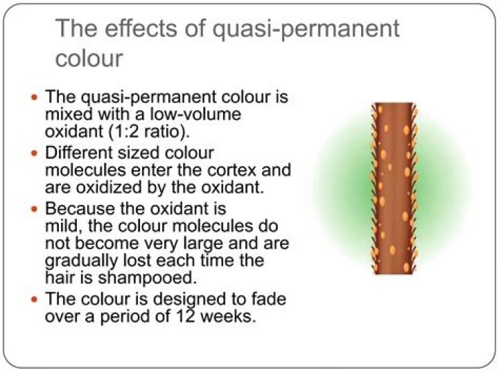 Quasi-permanent hair colour is a colour depositing product that's a mixture of oxidative colour (small colour molecules) and direct dyes (large colour molecules). ... Each time the hair is washed, some of the colour molecules are released from the cortex, which allows the colour to gradually fade over a period of 12 weeks.
