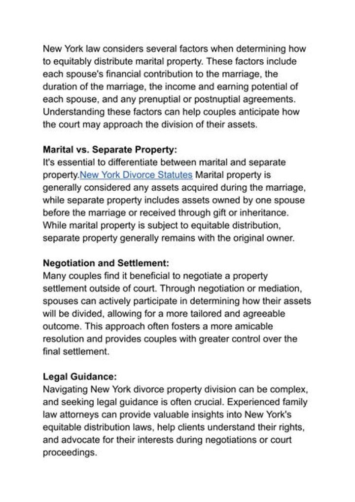 Equitable distribution means that, in a divorce, property will be equitably divided between the parties. ... Equitable distribution means that the court will aim to divide the property in a manner that is fair. In order to do this, the court will weigh a variety of factors, including: The duration of the marriage.