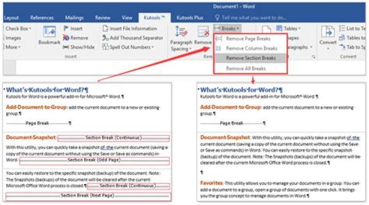 How do you remove page breaks and section breaks in Word?