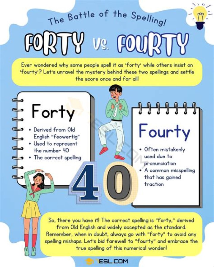 Forty is the proper spelling of the number in all English variants despite the fact that four contains a u. Often people will believe that fourty is a British variant like colour but this is also false.