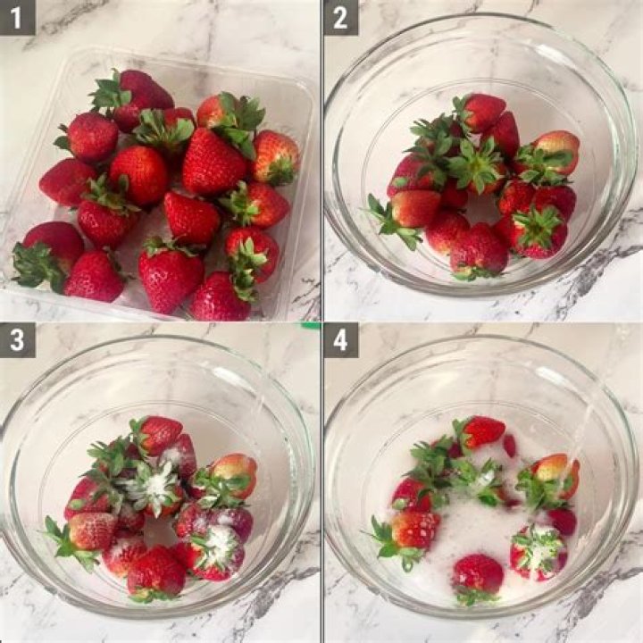 A vinegar bath can wash away any potential pesticide residue that may be lingering on your strawberries. To make a vinegar-water bath, combine 1 cup of white vinegar with 8 cups of water. The berries should soak in this bath for at least five minutes before you rinse them with cold, running water.