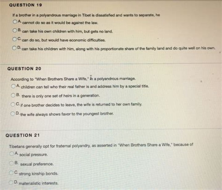 Polyandry is a form of polygamy in which a woman takes two or more husbands at the same time. For example, fraternal polyandry is practiced among Tibetans in Nepal, parts of China and part of northern India, in which two or more brothers are married to the same wife, with the wife having equal “sexual access” to them.