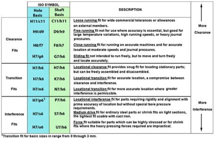 The fits are two digit letter/number designations where the hole basis fits are noted with a capital letter (H7) while the shaft basis fits are noted with a lower case letter (h7). ... For example, using a H7 hole basis as a reference, a strong interference fit would utilize a t6 shaft specification.