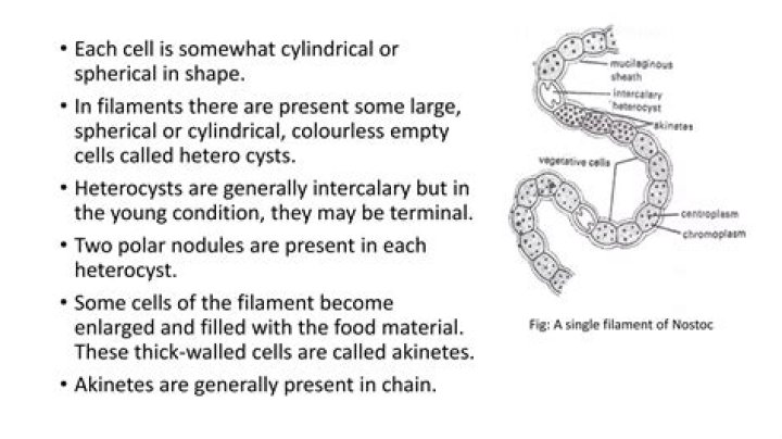 Cells of Nostoc spp. are spherical, barrel-shaped, or oval forming unbranched filaments. The filaments (trichomes) may contain both heterocysts (thick walled, specialized N-fixing cells) and akinetes (thick walled cell which functions as a resting cell).