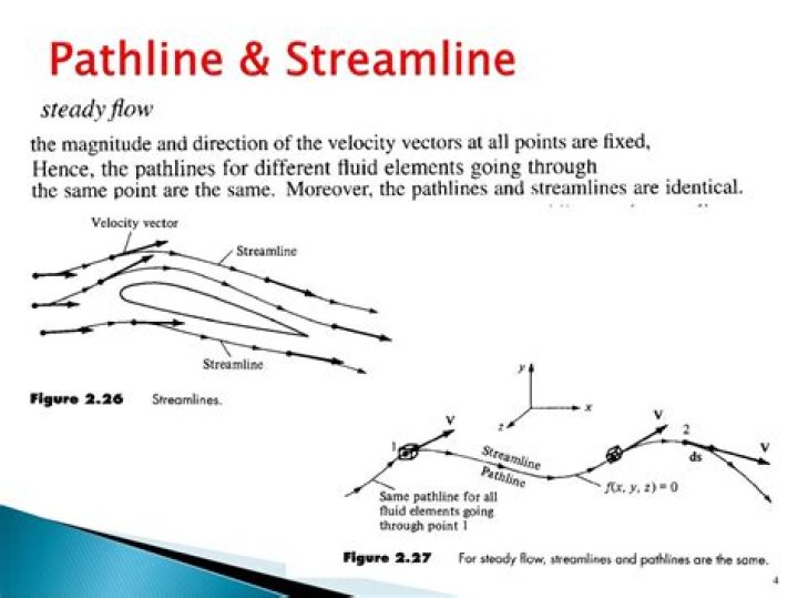 Streamlines are a family of curves that are instantaneously tangent to the velocity vector of the flow. These show the direction in which a massless fluid element will travel at any point in time. ... Pathlines are the trajectories that individual fluid particles follow.