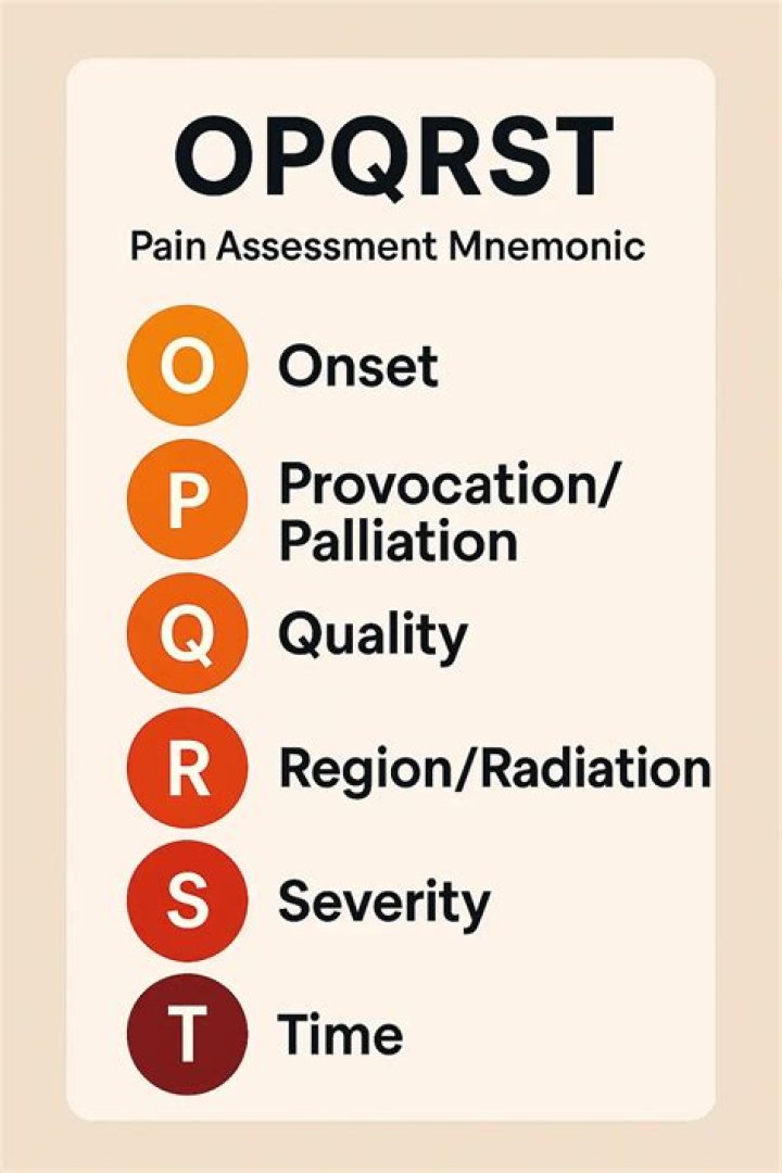 Each letter stands for an important line of questioning for the patient assessment. The parts of the mnemonic are: Onset , Provocation/palliation, Quality, Region/Radiation, Severity, and Time.