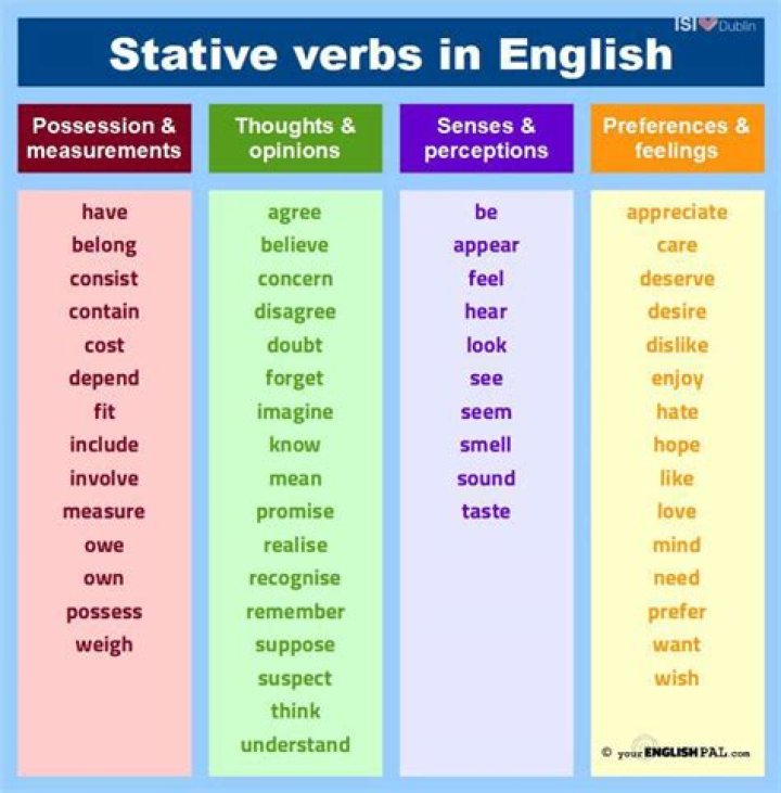 Stative verbs are verbs that express a state rather than an action. They usually relate to thoughts, emotions, relationships, senses, states of being and measurements.