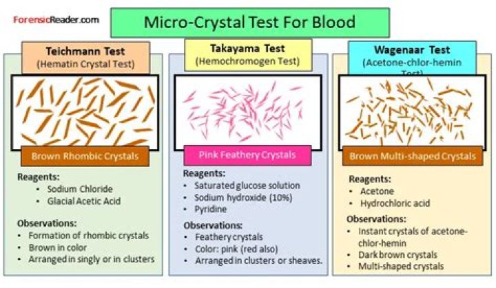 Phenolphthalein is a presumptive test that reacts with the heme molecule present in blood. A positive reaction gives a pink color. While bloodstains normally appear red-brown in color, the color of the substrate or the age of a stain may affect the appearance or visibility of the stain.