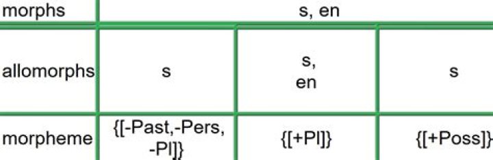 …of a morpheme are called allomorphs; the ending -s, indicating plural in “cats,” “dogs,” the -es in “dishes,” and the -en of “oxen” are all allomorphs of the plural morpheme.