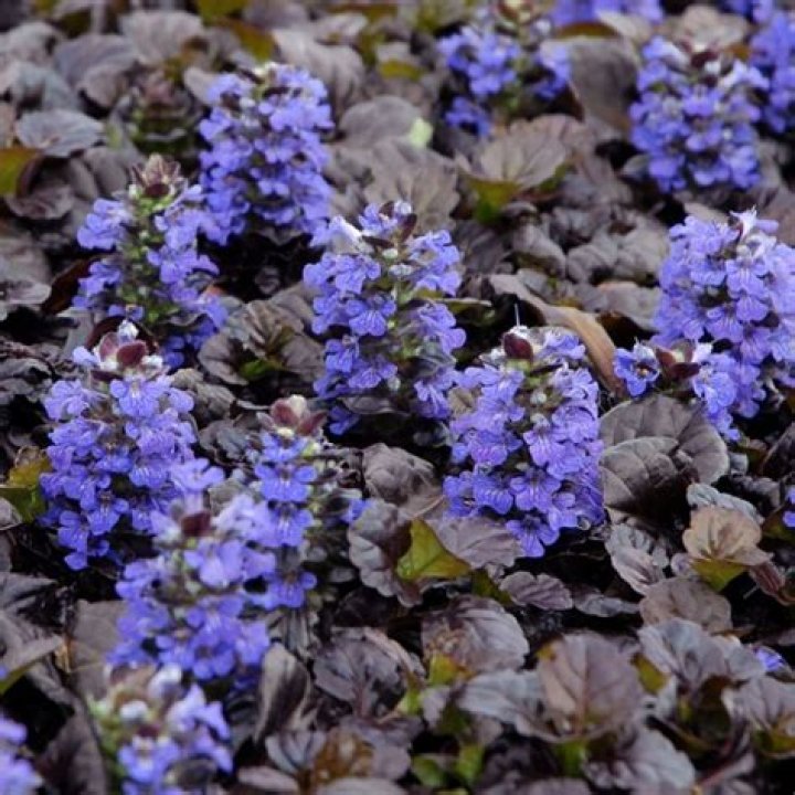 Ajuga reptans 'Black Scallop' (Carpet Bugle) is a creeping perennial prized for its short spikes of fragrant, deep blue flowers and very glossy, near-black, scalloped leaves. ... Ground-hugging, this perennial plant grows up to 3-6 in.