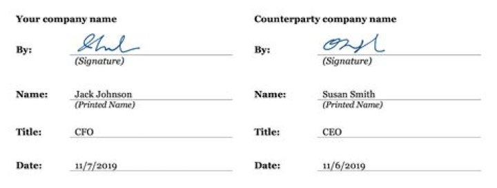“By” is where a person or representative of a company must sign. “Name” is the name of the person or entity signing the contract. “Title” applies to a person acting on behalf of a company or as a representative of someone else. For example: By: (your signature)