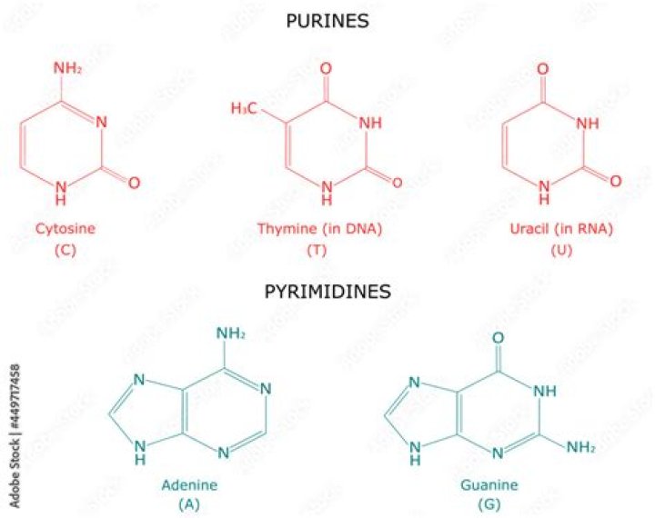 Because of their structural similarity, we usually refer the nine-member double rings adenine and guanine as purines, and six-member single-ring thymine, uracil, and cytosine are pyrimidines.