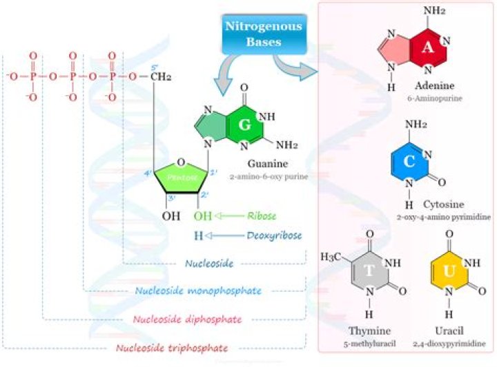 Nucleotide RNA and DNA are polymers made of long chains of nucleotides. A nucleotide consists of a sugar molecule (either ribose in RNA or deoxyribose in DNA) attached to a phosphate group and a nitrogen-containing base. The bases used in DNA are adenine (A), cytosine (C), guanine (G), and thymine (T).